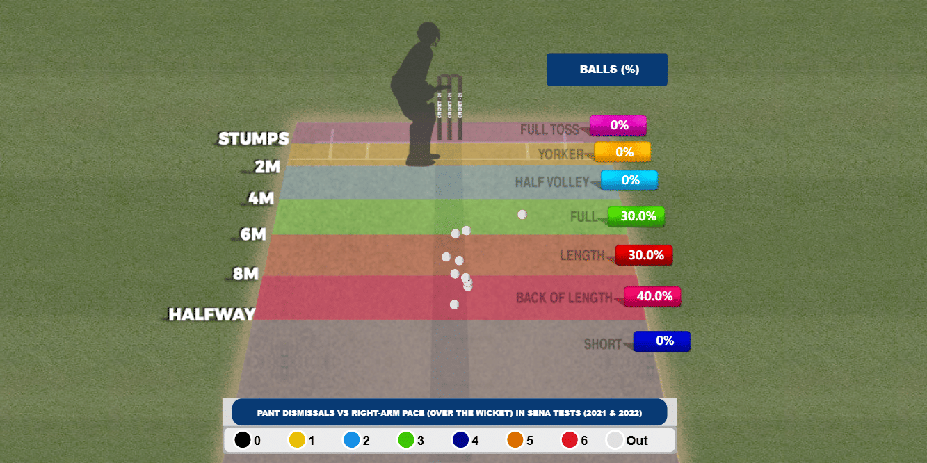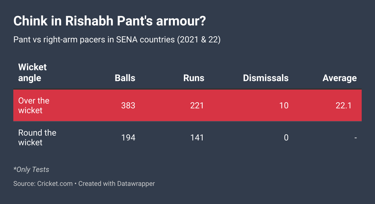 Purely from numbers, Pant has found it hard to tackle the ball from over the wicket against the right-arm pacers, especially when playing in SENA countries. In just two years (2020 & 21), all of the left-hander’s dismissals (10) against right-arm pace had been from over the wicket, where his average was 22.1.