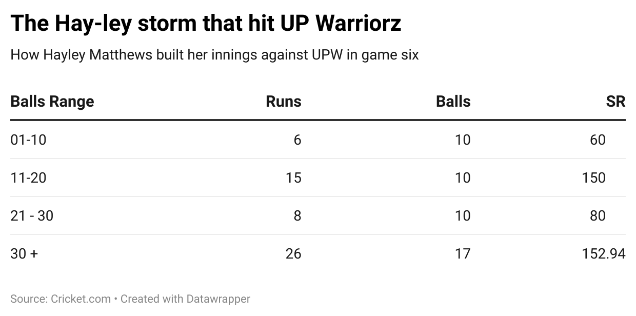 That’s what Matthews did. She faced 17 deliveries in the powerplay, and she only scored 11 but ensured that she remained unbeaten. She bode time and then punished the Warriorz with her swashbuckling batting.