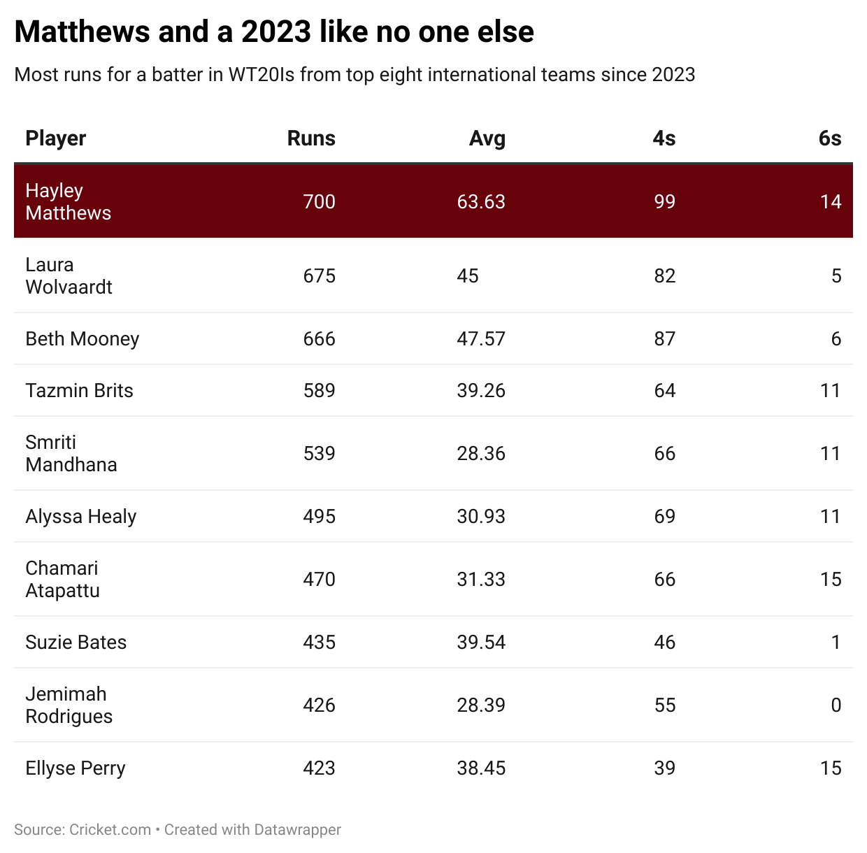 In 2023 alone, Matthews went on a whirlwind mode, scoring 700 runs. Let’s make it better for you: she scored those runs at an average of 63.63, with a strike rate of 132.3.