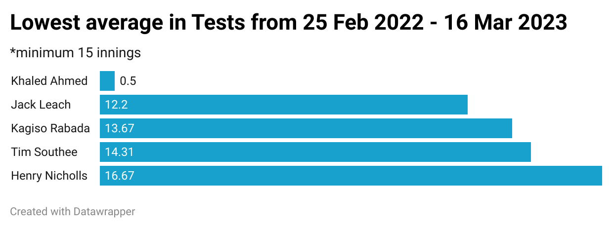 To give some context, among 42 players who’d batted at least 15 times in this period, only Tim Southee (14.31), Kagiso Rabada (13.66), Jack Leach (12.20) and Khaled Ahmed (0.50) fared worse.