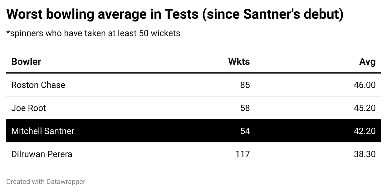 The numbers are indeed as bad as they look: since Santner’s Test debut in November 2015, 23 spinners (part-timers included) have taken 50 or more wickets. Among them, only Joe Root and Roston Chase have a worse average.