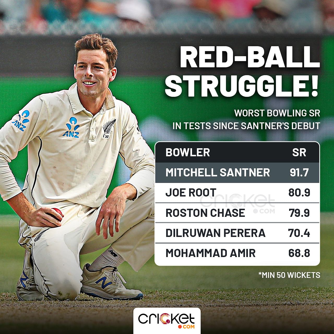 Removing the ‘spinner’ filter, Santner’s strike rate of 91.6 is the worst among ALL BOWLERS who have taken 50 or more wickets since his Test debut. The difference is so stark that the bowler with the next 'worst' strike rate, Root, has managed to strike every 81 balls as compared to Santner's 92.