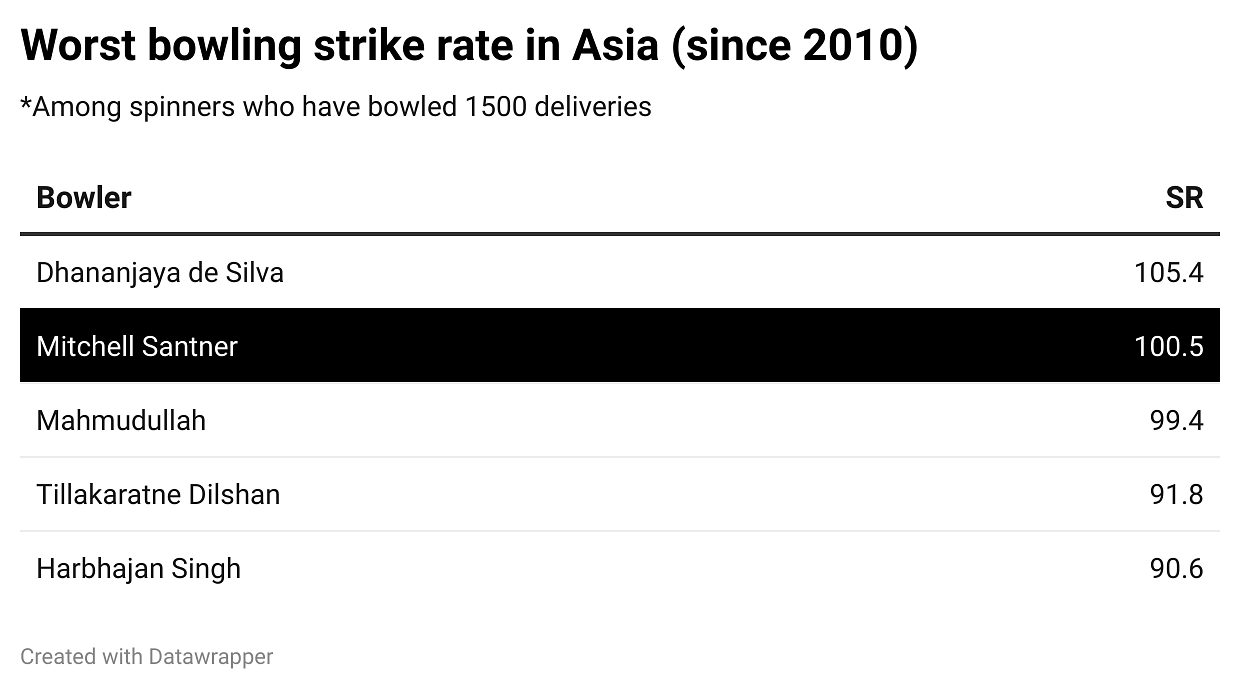 Since 2010, there have been 48 spinners who have delivered 1500 or more deliveries in Asia. Among them, only one has registered a worse strike rate than Santner: Dhananjaya de Silva, who is primarily a batter.