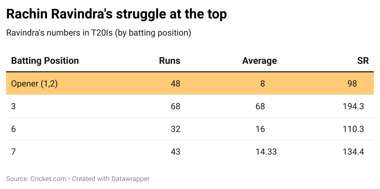 Ravindra has rarely opened throughout his T20 career. Only on eight occasions has the left-hander opened, and (look away) his numbers aren’t even close to being world-class. The 24-year-old has scored just 54 runs off 59 balls, averaging just 6.75 as an opener.