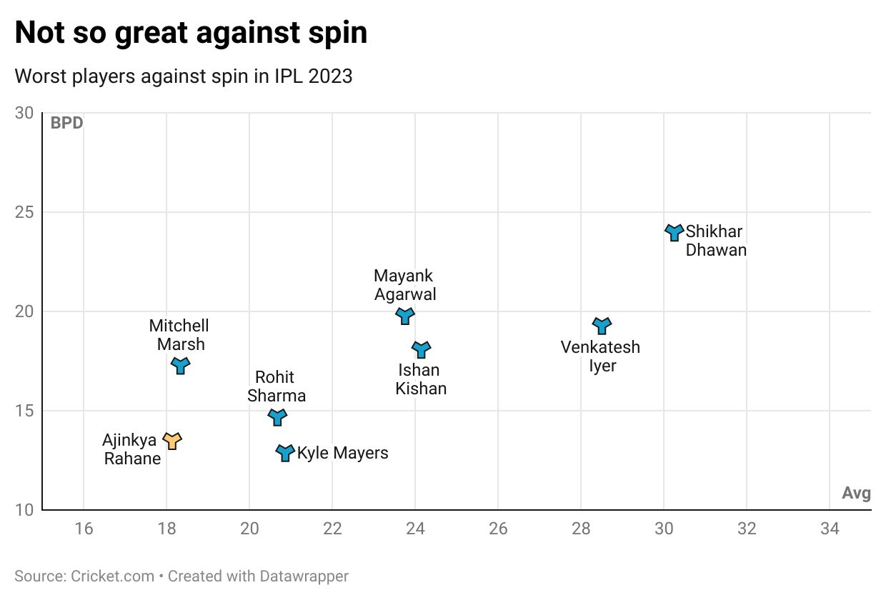 Last year, it was evident that the opposition often brought their best spinner on to bowl when Rahane walked out to bat. The results were there for everyone to see. Against spin in IPL 2023, the right-handed batter only scored 161 runs, averaging 20.13, striking at 136.44.