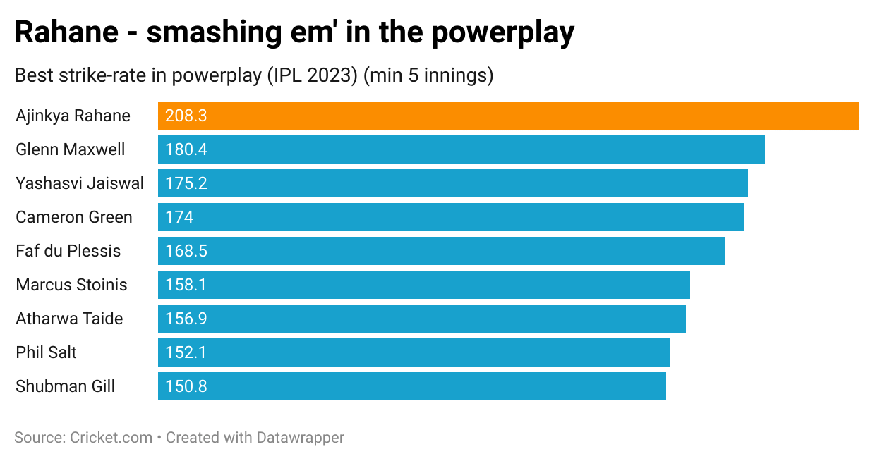 That’s almost a difference of 20 between him and the second-best, Glenn Maxwell. Rahane’s impact couldn’t have been more pronounced in the powerplay. He’s faced 60 deliveries in the 2023 edition and scored 125 runs without being dismissed.