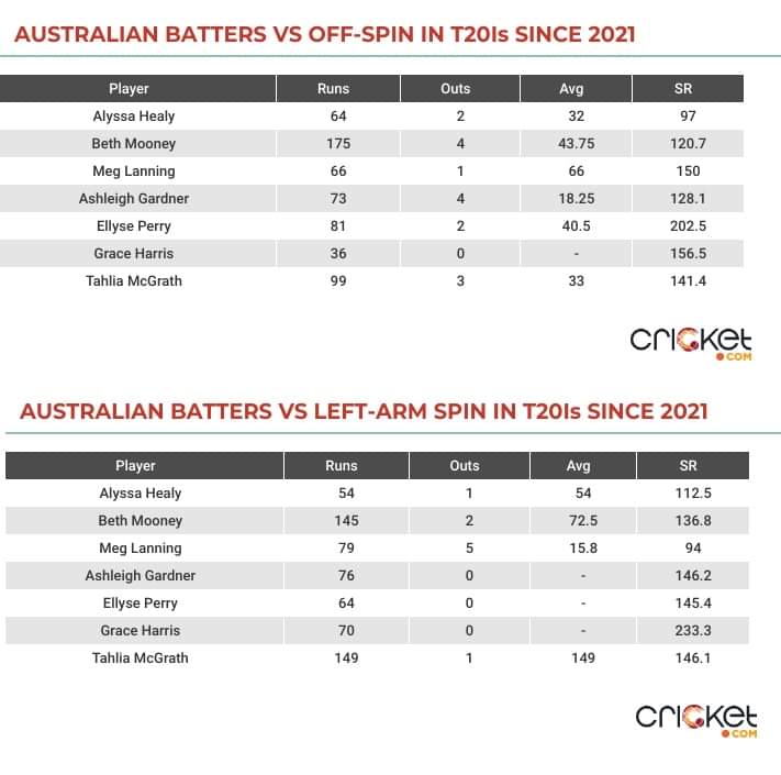 Deepti, who’s largely been under-utilized with the bat in this T20WC, has outstanding H2H records against two of Australia’s premier bowlers, Megan Schutt (53 off 32 balls) and Alana King (28 off 14 balls).