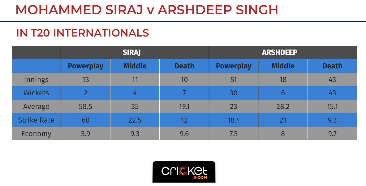 Siraj had a good IPL 2023 (19 wickets @ 19.7), but apart from that, the right-armer has struggled to pick wickets in this format. In 52 T20s since 2022, Siraj has an average of 30.6, which goes up to 38.3 in the first six overs. Siraj has almost been at par with Arshdeep in the IPL, but the latter transforms into a different beast while playing for India.