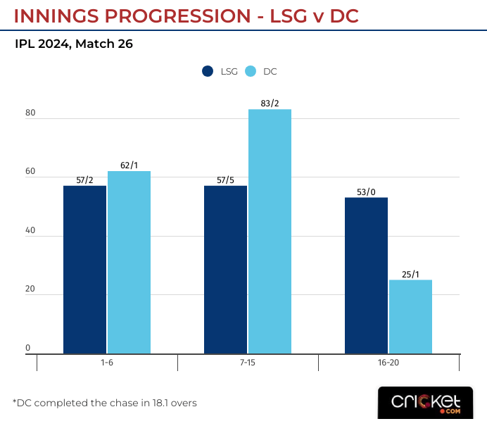 The innings progression tells how the middle-overs broke the chase in DC’s favor.
