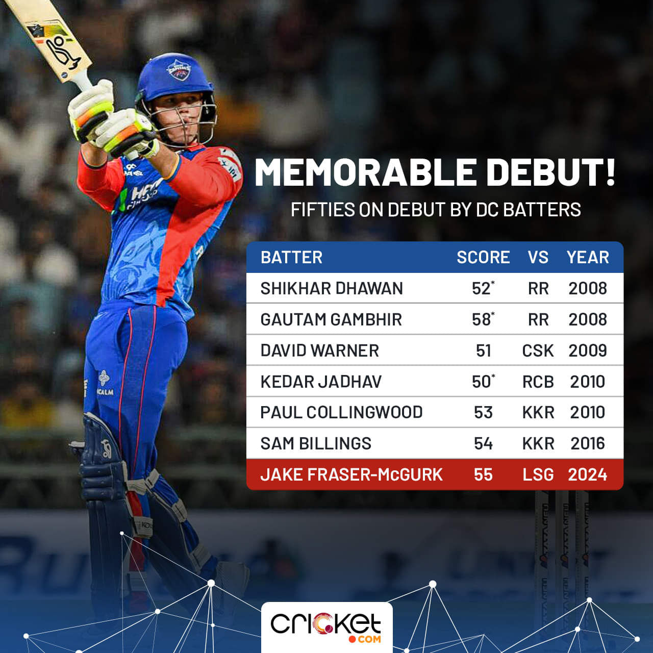 Jake Fraser-McGurk justified the hype around his much-awaited debut. His first two scoring shots were sixes. He slowed down in between but recovered with three consecutive sixes off Krunal Pandya in the 13th over. He scored 55 off 35 balls (exactly what Badoni scored) and ensured that Delhi are ahead of the asking rate.