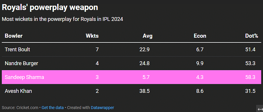 Sandeep Sharma, who hadn’t been used in the powerplay for a long time, was thrown the ball back in that phase, and the veteran responded in fine fashion. In RR’s last four games, that has been a major reason behind their stranglehold in the powerplay, with Sandeep striking three times in 24 balls.