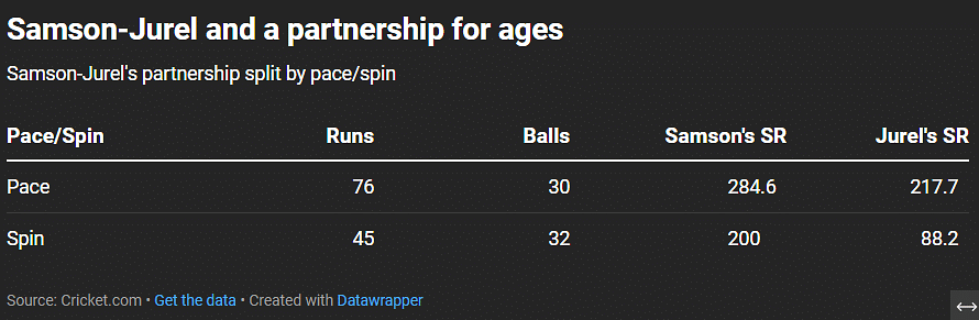 In three of RR’s last 100-run partnerships, one name has been constant, and that is Samson. When Jurel walked out to bat, he was well aware of that. He knew a match was to be won, and Samson, too, was aware.