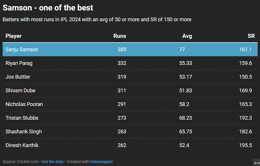 In case numbers prove anything, Samson (385 runs) is only behind Virat Kohli (430) regarding runs scored. When you look at the other metrics, like the best middle-order batter in this year’s competition, no other Indian batter has as many runs as Samson’s 385 at No.3, 4 or 5.