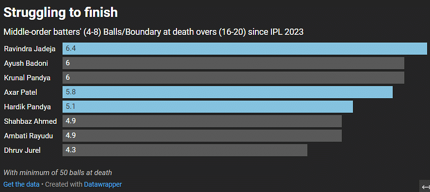 Sorry to break the bubble, but on average, finishers find a boundary very frequently, one every 4.06 deliveries. Then there is the asterisk: not everyone, at least definitely not Hardik, who only scores a boundary every 5.1 deliveries.