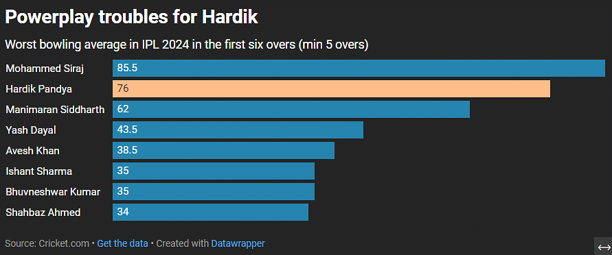 Guess what? Hardik conceded runs at 7.8, almost one run over the average. Extending it to the entire powerplay phase, he isn’t even in the top 30 wicket-takers. If you filter it further down (since 2022), only 11 bowlers have an average worse than the Baroda all-rounder.