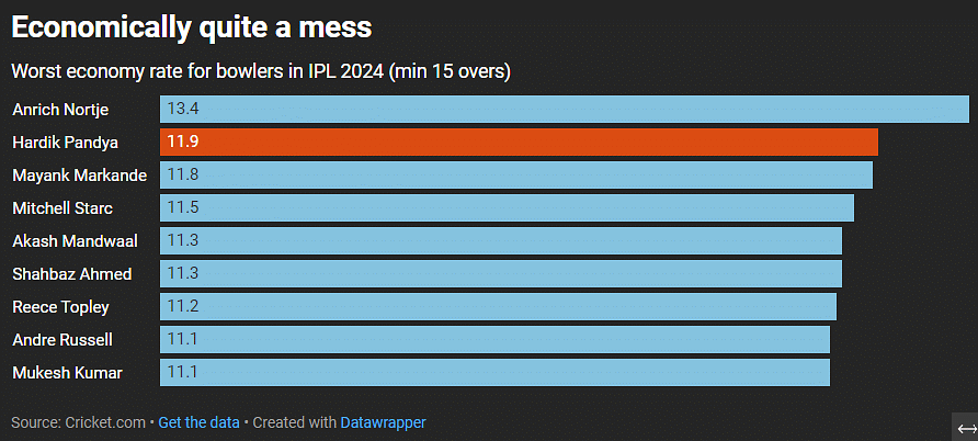 Only one bowler in this year’s competition (min 15 overs) has an economy rate worse than Hardik’s 11.9, and that’s Anrich Nortje (13.4). The more Hardik has bowled this year, the more Mumbai faced a setback.