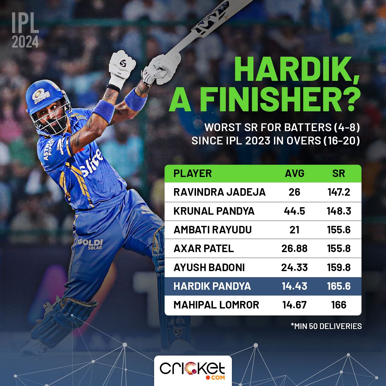But even in that far-fetched list of top finishers in the Indian Premier League (IPL) over the last two years, sighting Pandya is a miraculous task. With a minimum of 50 deliveries at the death, Hardik is not even in the top 25 finishers in the tournament.