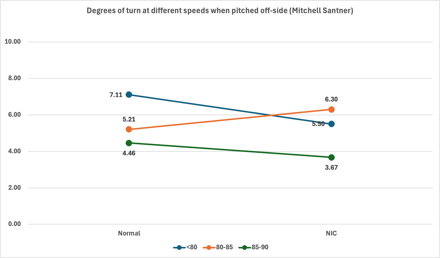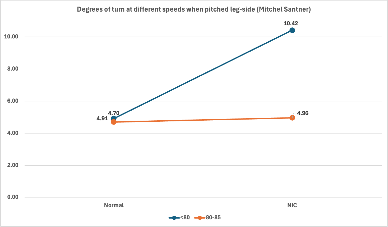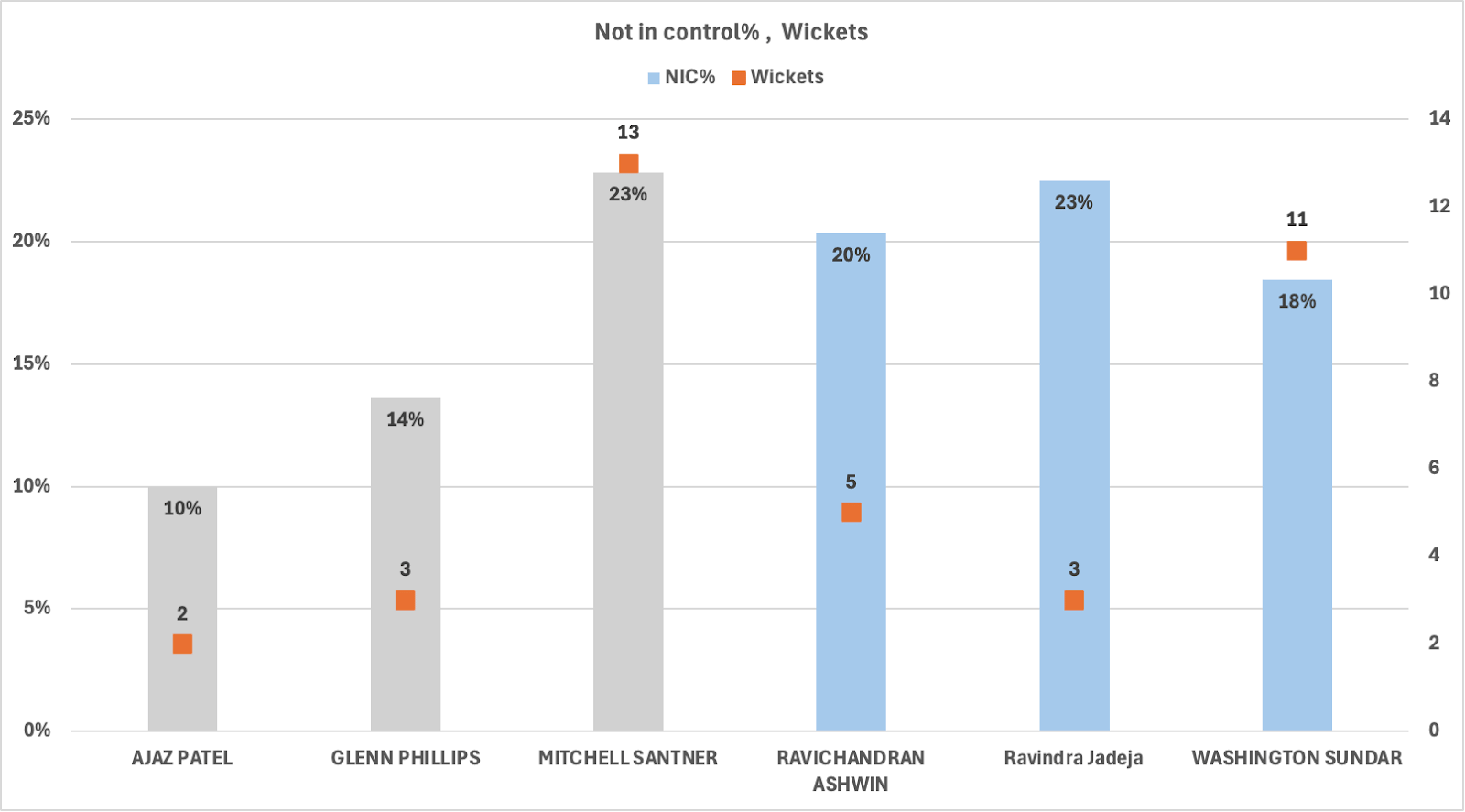 The NIC (Not in Control) deliveries turned more than the normal deliveries, which means that Santner generated false shots by turning the ball more. This is the right way to do it when the ball is pitched on the leg side.