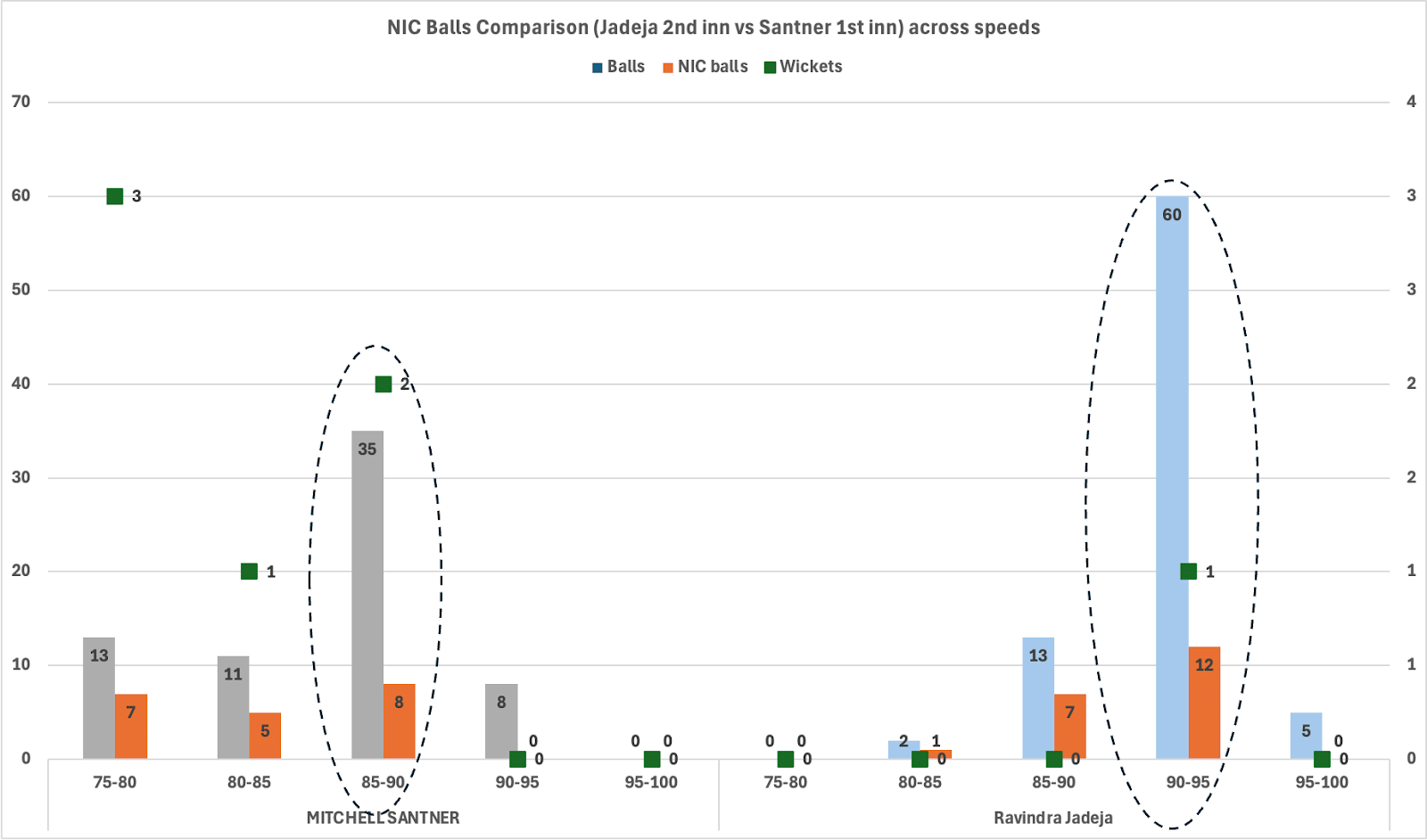 There is also a speed range of 80-85 kmph in which the not-in-control balls turned more. There were eight such balls, out of which three were false shots that resulted in no wickets. Very poor conversion rates from false shots to wickets. The ball turning away from the right-handers from the off-stump line was the most unproductive delivery for Santner. This is precisely how Jadeja bowled across all the speed ranges.