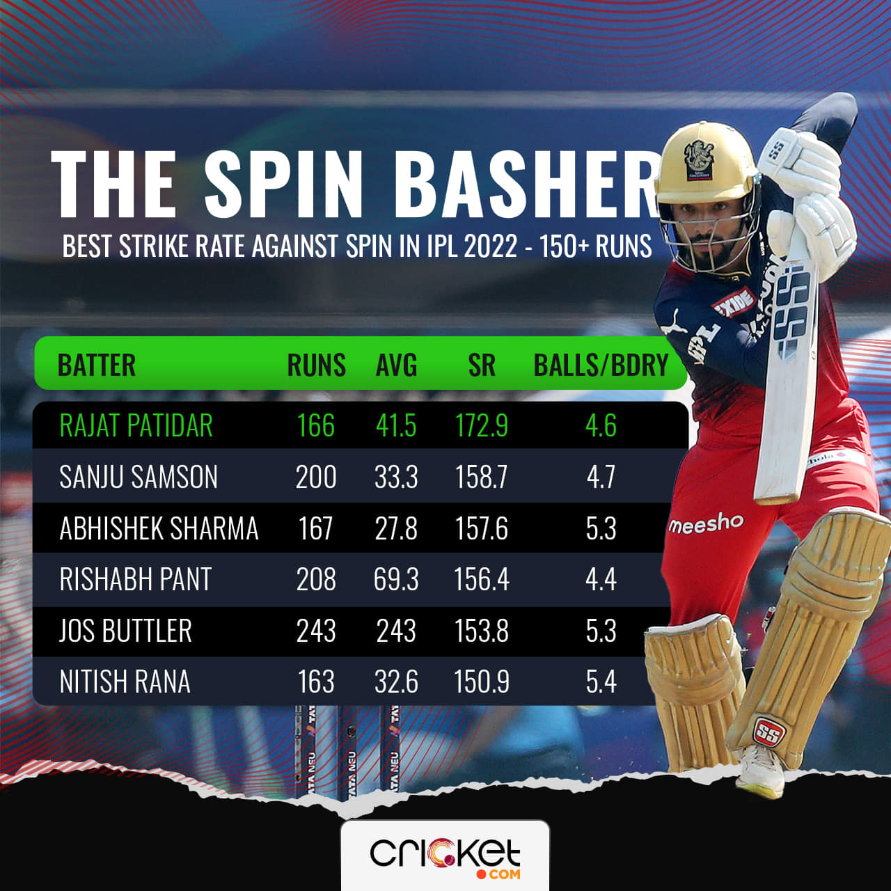 Last season, among batters with 150+ runs against spin, no batter had a strike rate as high as Patidar. His balls/boundary ratio of 4.6 was the second-best in this category. To emboss more, he had hit a six every eight balls, the best for a batter.