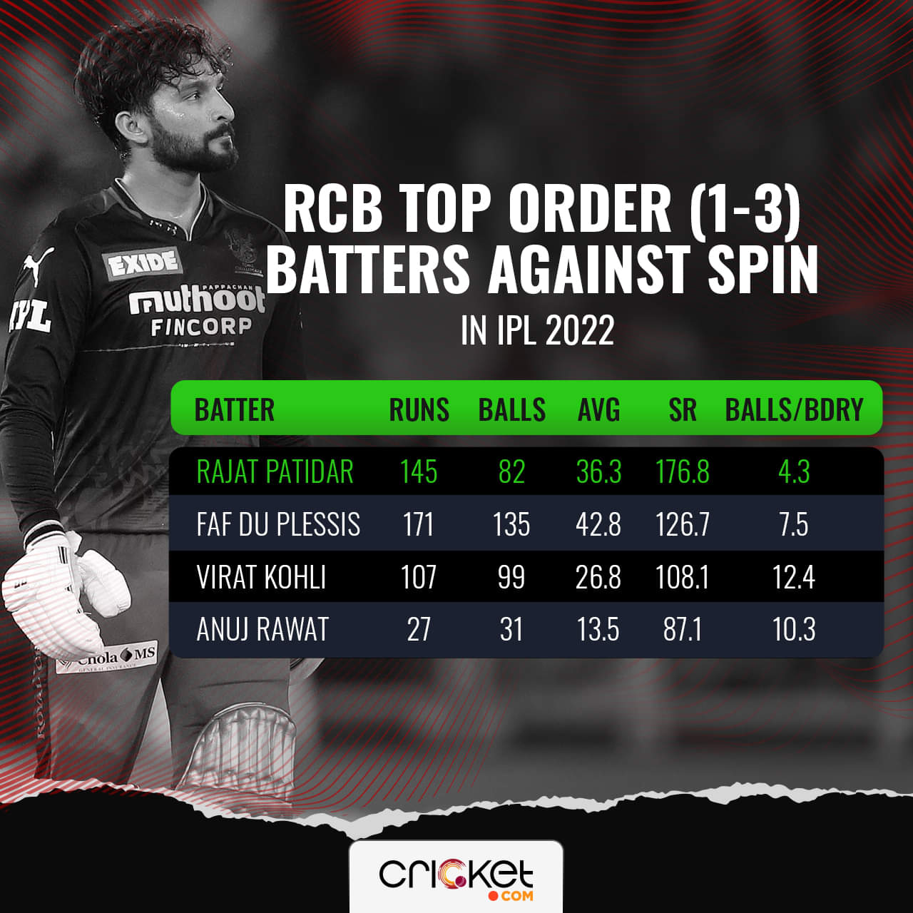 The bigger picture for Bangalore is that, apart from Maxwell, they do not have a spin-basher like Patidar. Kohli and Faf might average better against them, but their strike rate leaves a lot to be desired.