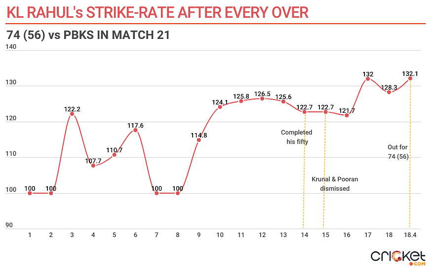His strike-rate didn’t consistently go beyond 100 up until the halfway mark. There was a surge around the halfway mark but it never took off from there. He brought his fifty from 40 balls. Despite having wickets in hand, Lucknow garnered only 62 runs in the middle-phase (overs 7 to 15).
