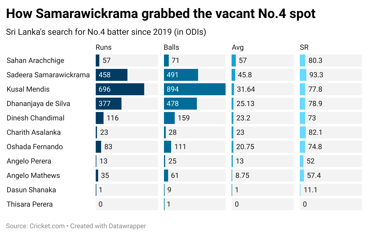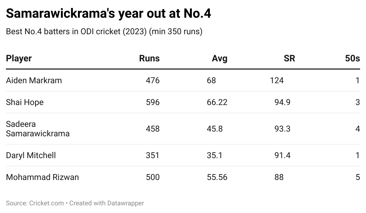 It was perhaps a culmination of all of that which has changed Sri Lanka’s fortune. Only five Number fours have scored more than 300 runs in the calendar year, and Samarawickrama’s strike-rate - 93.3 - stands as the third-best amongst the list.