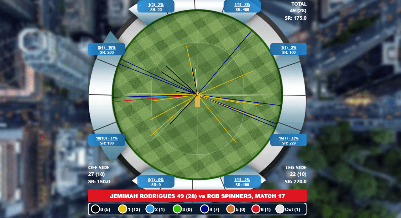 Anything wide and away from her reach was punished with a strike-rate of 246.2, scoring 32 off just 13 deliveries. Anything on the pads, you don’t even have to ask; it was swept away for a four. Jemimah was a menace for the RCB spin unit.