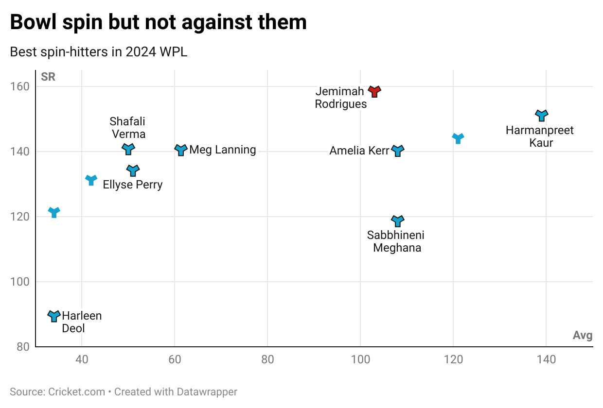 With a minimum of five overs against spin, Jemimah has the second-best strike-rate in the competition, only behind Kiran Navgire, scoring at 158.5. Unlike Navgire, she only gets out once every 65 deliveries, only behind Harmanpreet Kaur, Meghana, Deepti Sharma and Amelia Kerr.