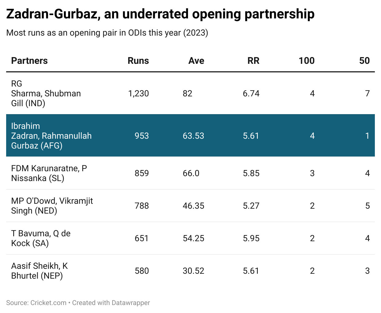 In 2023, as a duo, Zadran-Gurbaz have scored 953 runs, averaging 63.53, with a run-rate of 5.61. If one played spin really well, the other was a proper batter against pace.