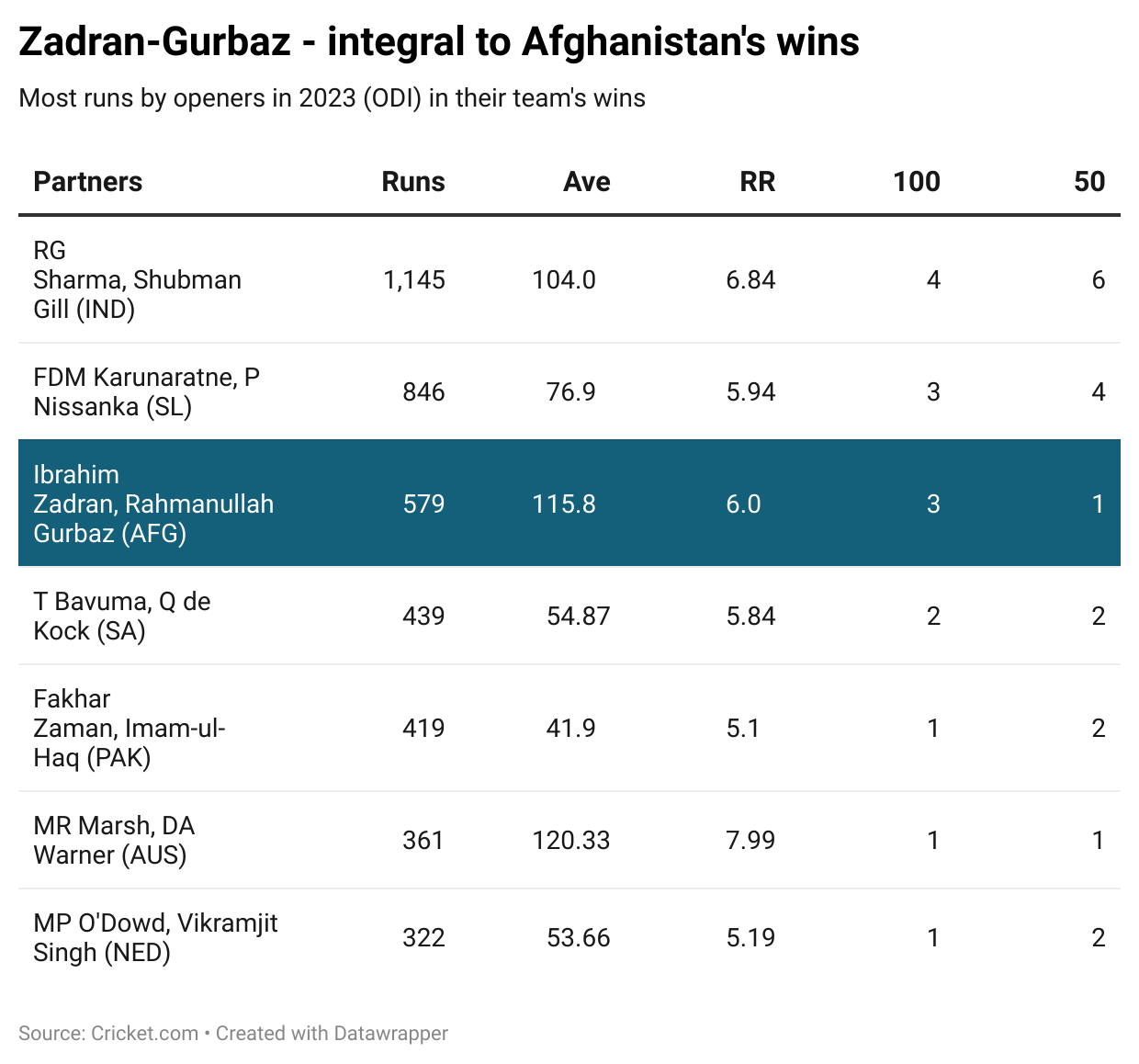 Across those four wins, there was an evident pattern - the opening-wicket partnership. Zadran-Gurbaz averaged 112.5 in Afghanistan’s wins, scoring 449 runs in 73.5 overs, scoring the crucial runs at a run-rate of 6.08, with two hundred-run partnerships and a fifty-run partnership.