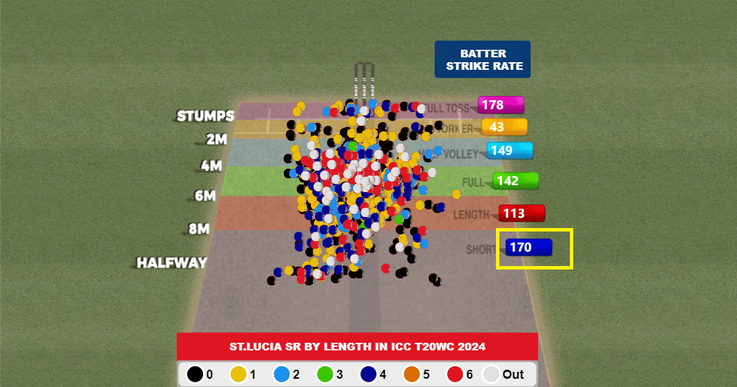 4. Short balls have been dispatched by the batters across various parts of the ground, resulting in the highest batting strike rate at a short length for any venue.