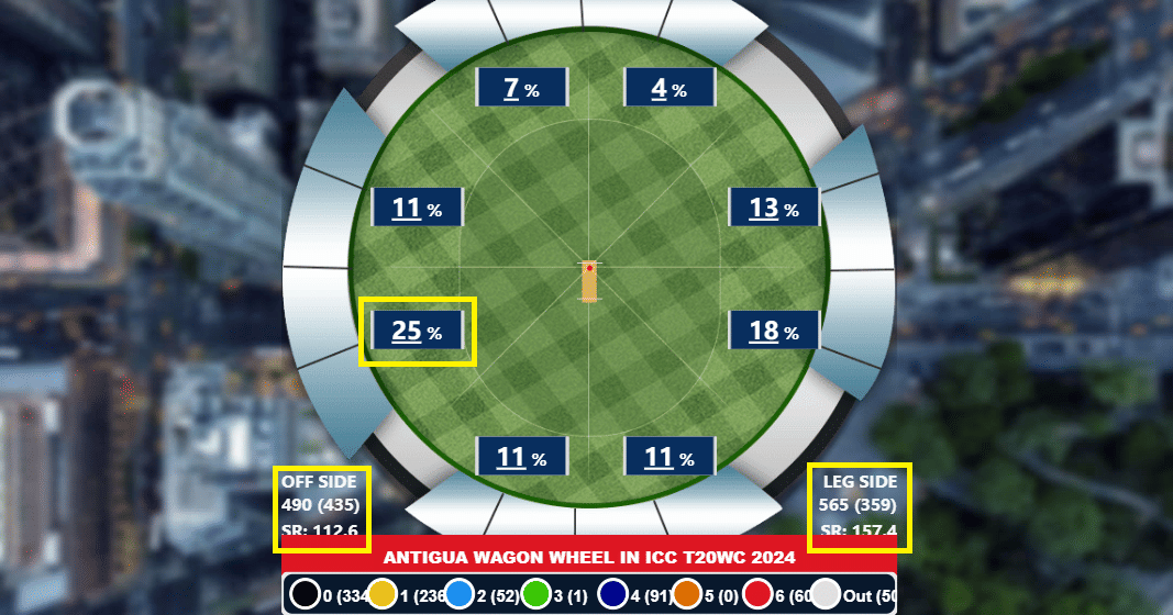 3. There is a big difference in the scoring rate on the off-side when compared to leg-side in Antigua. This is due to the skewed ground dimensions.