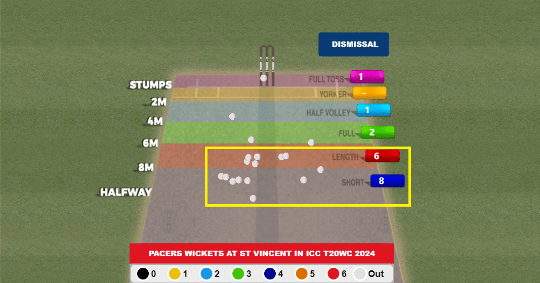 3. Short balls and back-of-a-length balls have worked like a charm for the quicks at this venue. 14/18 wickets taken by pacers in St Vincent have been off deliveries that have been either 6m or shorter.