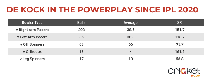 Off-spin needs to be mentioned here because since IPL 2020, in the powerplay, de Kock has struggled immeasurably against offies, managing just 66 runs off 69 balls. It has, by some distance, been his least favorite bowling-type to face up front (min 25 balls). By deploying Sundar, who is a renowned specialist with the new ball, SRH could tame de Kock.