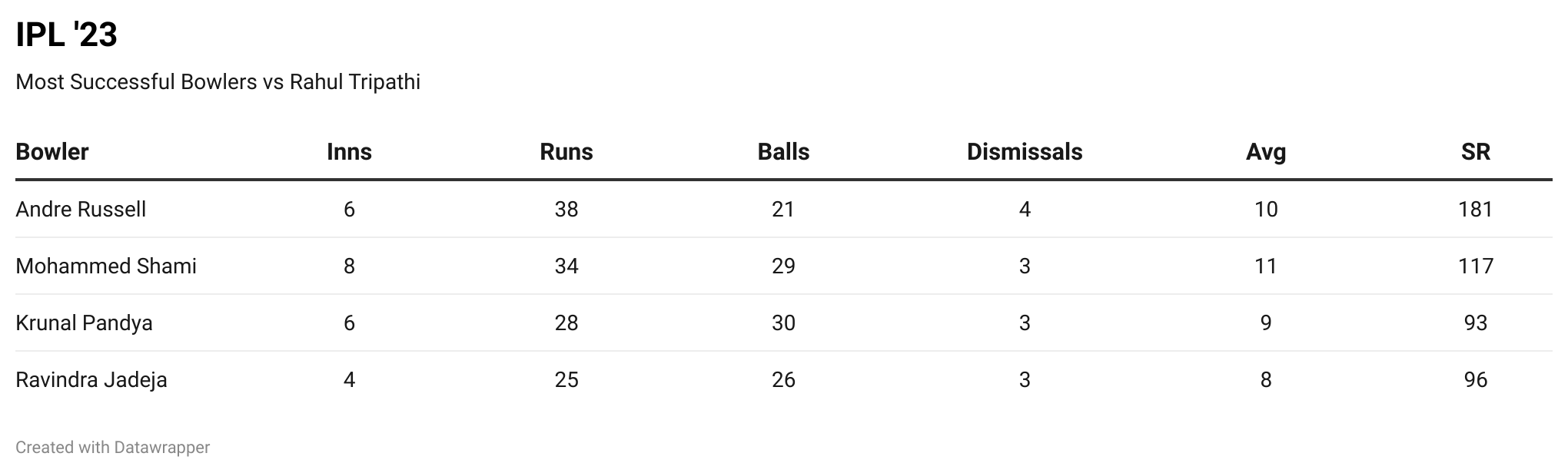A matchup to watch out for is between Tripathi and Krunal. Tripathi has been dismissed three times against Krunal in T20s, which is the second joint-most for a bowler in T20s.