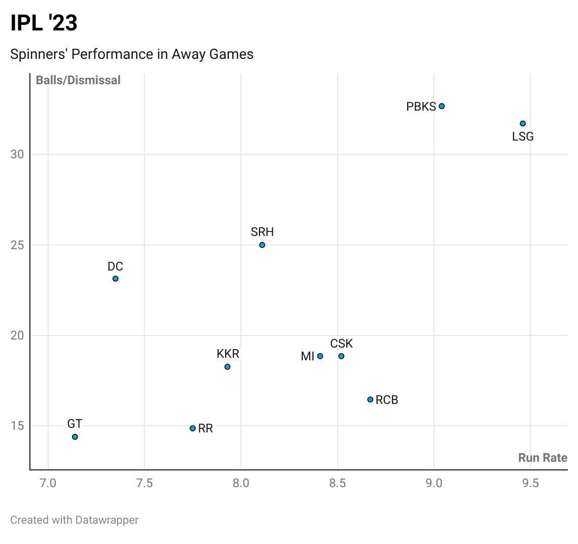 This season, Hyderabad batters have struggled to get going against spin. Their batting unit has the second-worst run rate and the third-poorest balls/dismissal while facing spin. Even while chasing 214 in their last game, they scored at 7.9 RPO against RR spinners. They will take heart from how LSG spinners have underperformed outside Lucknow. Their spin attack has the worst away numbers for any team in IPL 2023.