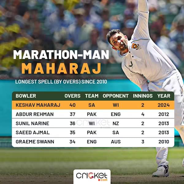 He was introduced into the attack by skipper Temba Bavuma in the 13th over of West Indies’ innings during the first session of Day 3. He bowled through the small rain interruptions, continued bowling in the afternoon and evening sessions, and ended his spell late on Day 4, which started after a very long rain break.