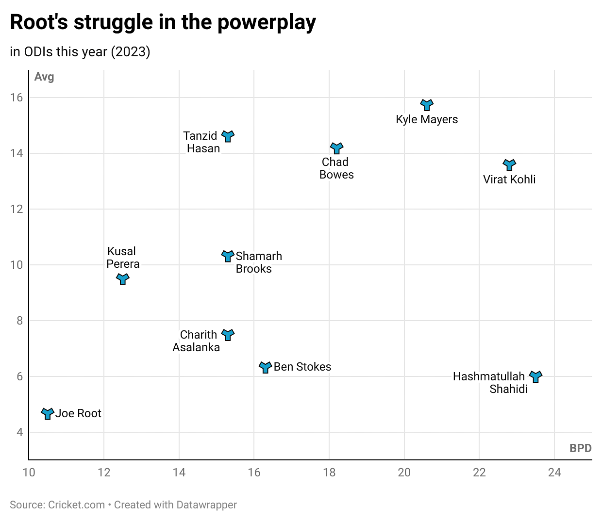 When he walked back to the dressing room that night, his average in the powerplay went to 4.67 in the powerplay, the worst for any batter in that phase this year (min 5 innings). The image of Root’s head falling down as he walked back to the pavilion was nothing short of an accurate representation of England’s campaign.