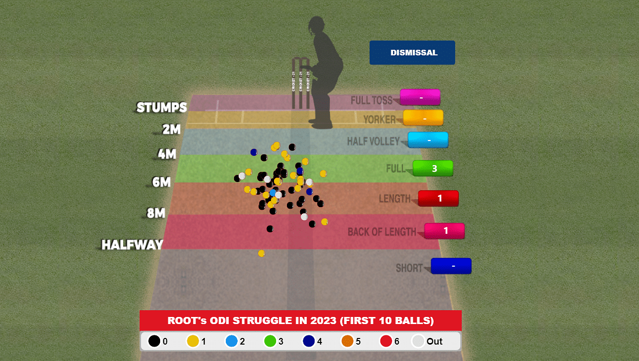 As a result, Root has scored just three boundaries in that phase since the start of 2023 in the first ten balls at the crease. In fact, out of the 20 dismissals post the 2019 ODI World Cup, the English batter has been dismissed nine times (45%) in the first ten balls, out of which five have come this year alone.