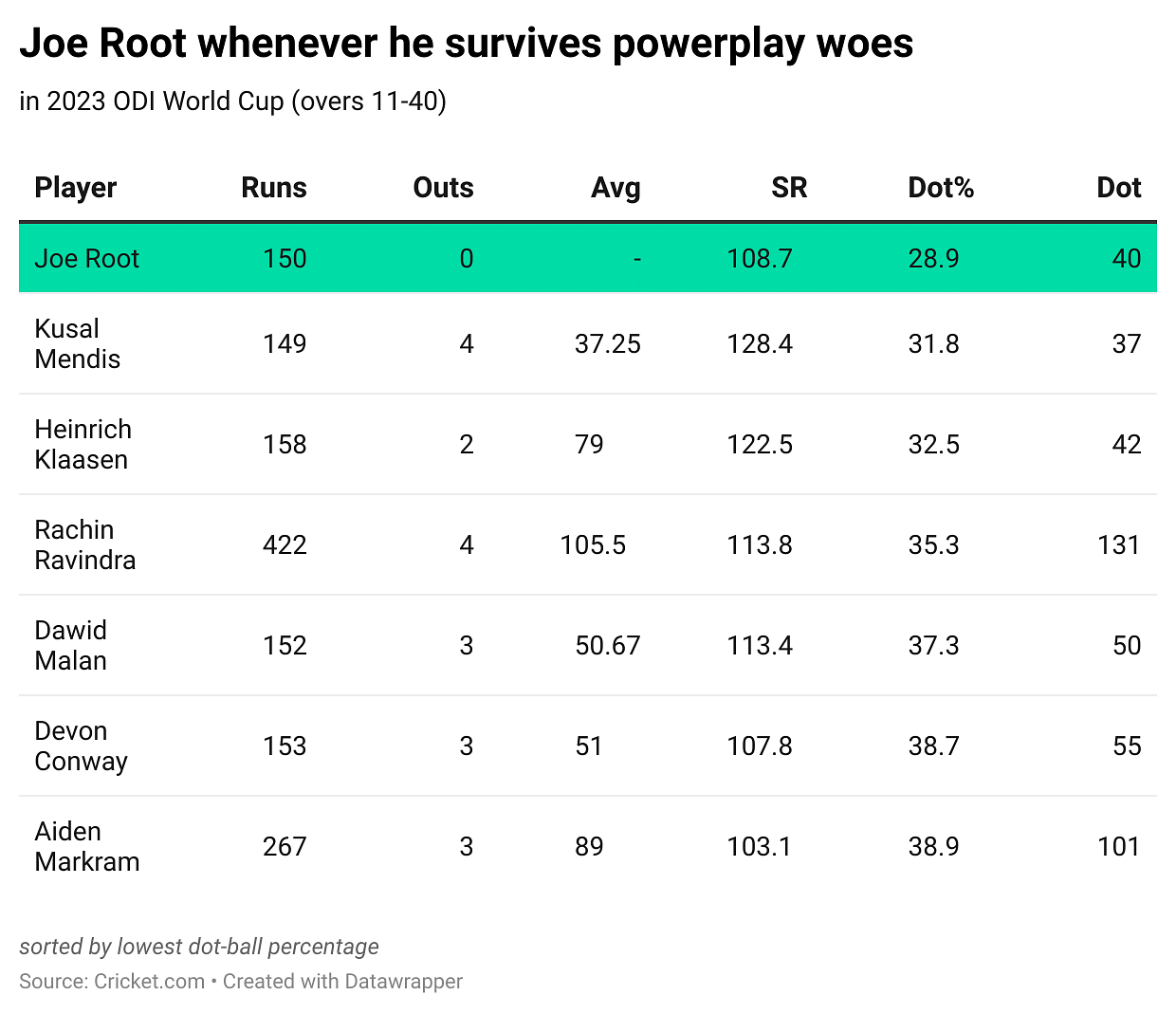 Whenever Root has gone on to survive the powerplay phase, he has been nothing short of god-like in this tournament. Across 138 deliveries in the middle-over phase, Root has not yet been dismissed, with a strike-rate of 108.7.