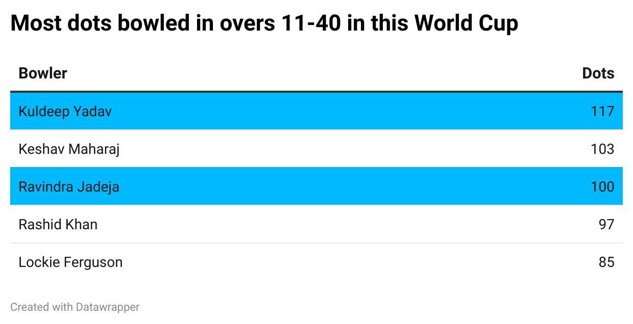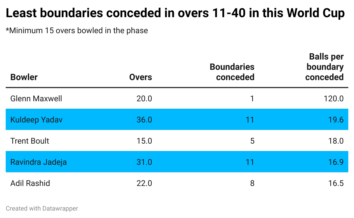 So far this World Cup, Kuldeep and Jadeja have combinedly bowled 67 overs in the 11-40 phase. Remarkably enough, together they’ve conceded less than 25 boundaries in this phase.