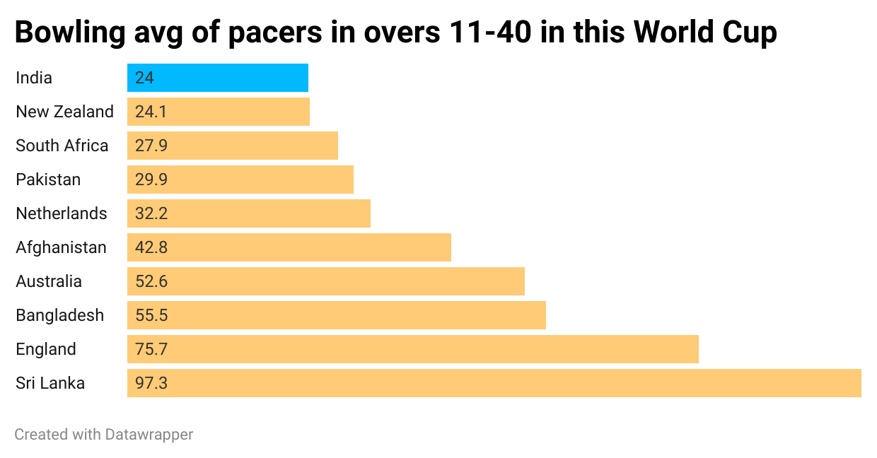 The Indian pacers have also been beneficiaries of the pressure built by Kuldeep and Jadeja. After 17 games, the Indian pacers’ average of 24.00 in overs 11-40 is the best among all teams.