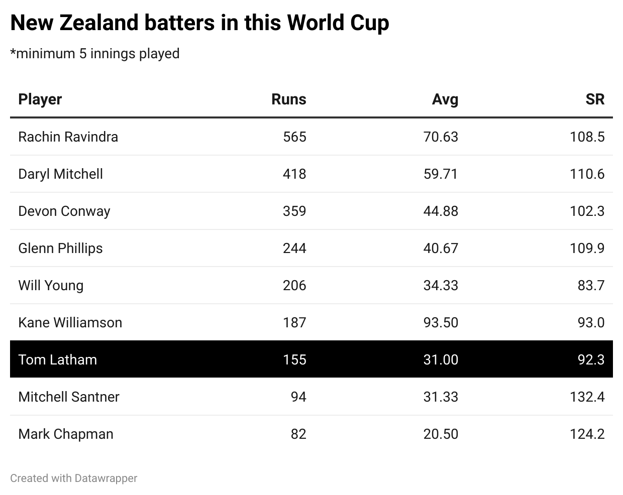 Unlike captaincy, though, there have been no stability issues for Latham in terms of his batting, having batted at his usual No.5 position in each of the first five matches, only moving down the order against Pakistan and Sri Lanka in order to accommodate the big-hitters. This very part makes his dull campaign even more damning.