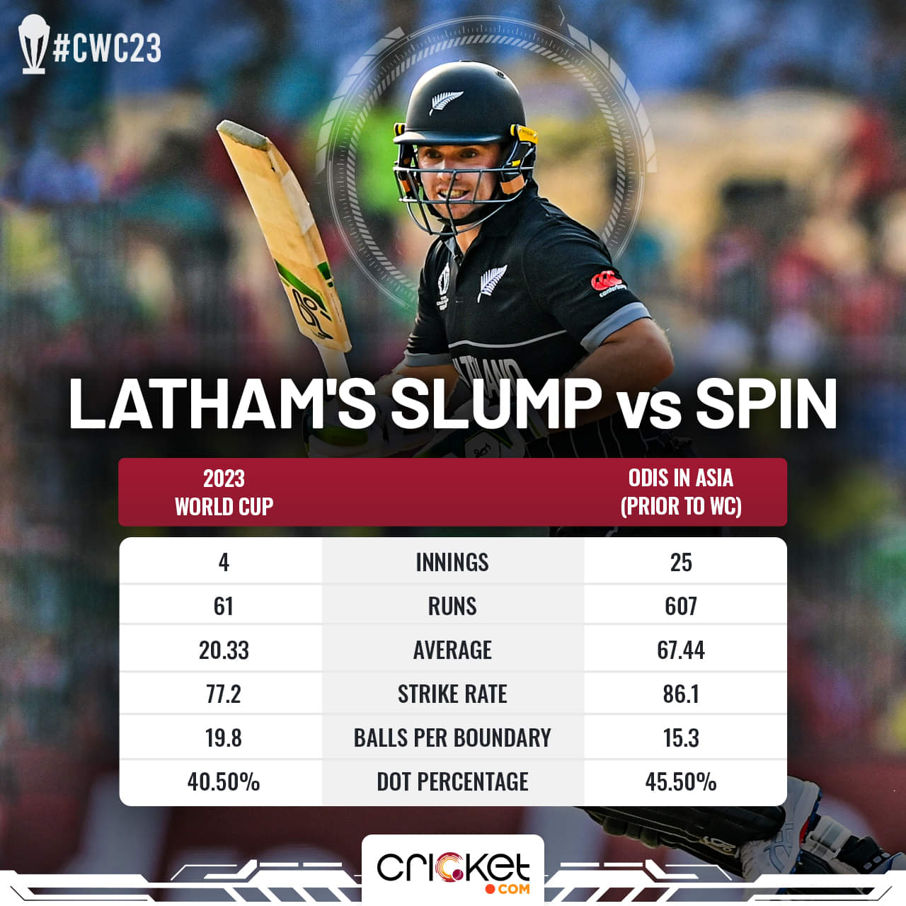 Curiously enough, in both the India and Australia encounters, it was spin that resulted in the undoing of Latham. However, not just in those two games, the left-hander has struggled against spin all tournament.