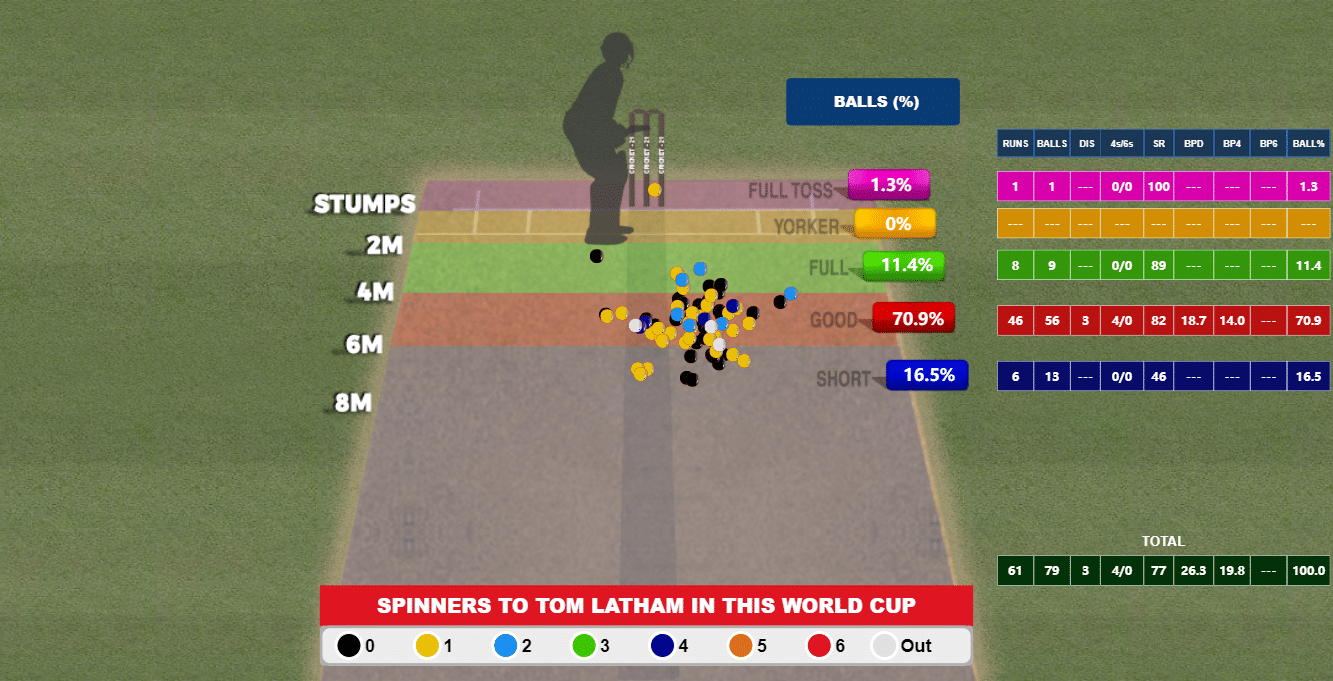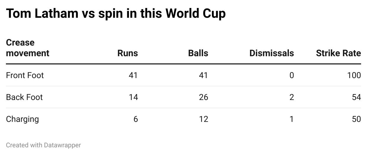 Two of Latham’s three dismissals against spin in this World Cup have come against wide deliveries, but in general, his struggles have been against deliveries aimed at the stumps: the left-hander has managed to strike at just 64 against ball targeting the stumps, playing a host of dots.