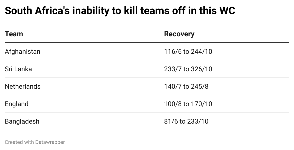 Here’s a good measure of how poor South Africa have been when it comes to finishing the job off versus the lower-order: 42 games into this World Cup, there have been 11 instances of teams adding 50 runs or more for the seventh wicket or below. 5 of these 11 fifty-run stands have come against South Africa. That’s more than 45%.