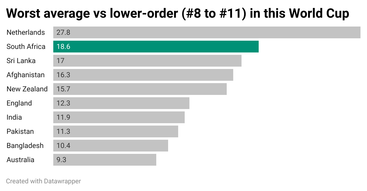 Yet unfathomably enough, they’ve been the second-worst bowling unit in this World Cup exclusively against the lower-order (No.8 to No.11), averaging 18.6 runs per wicket.