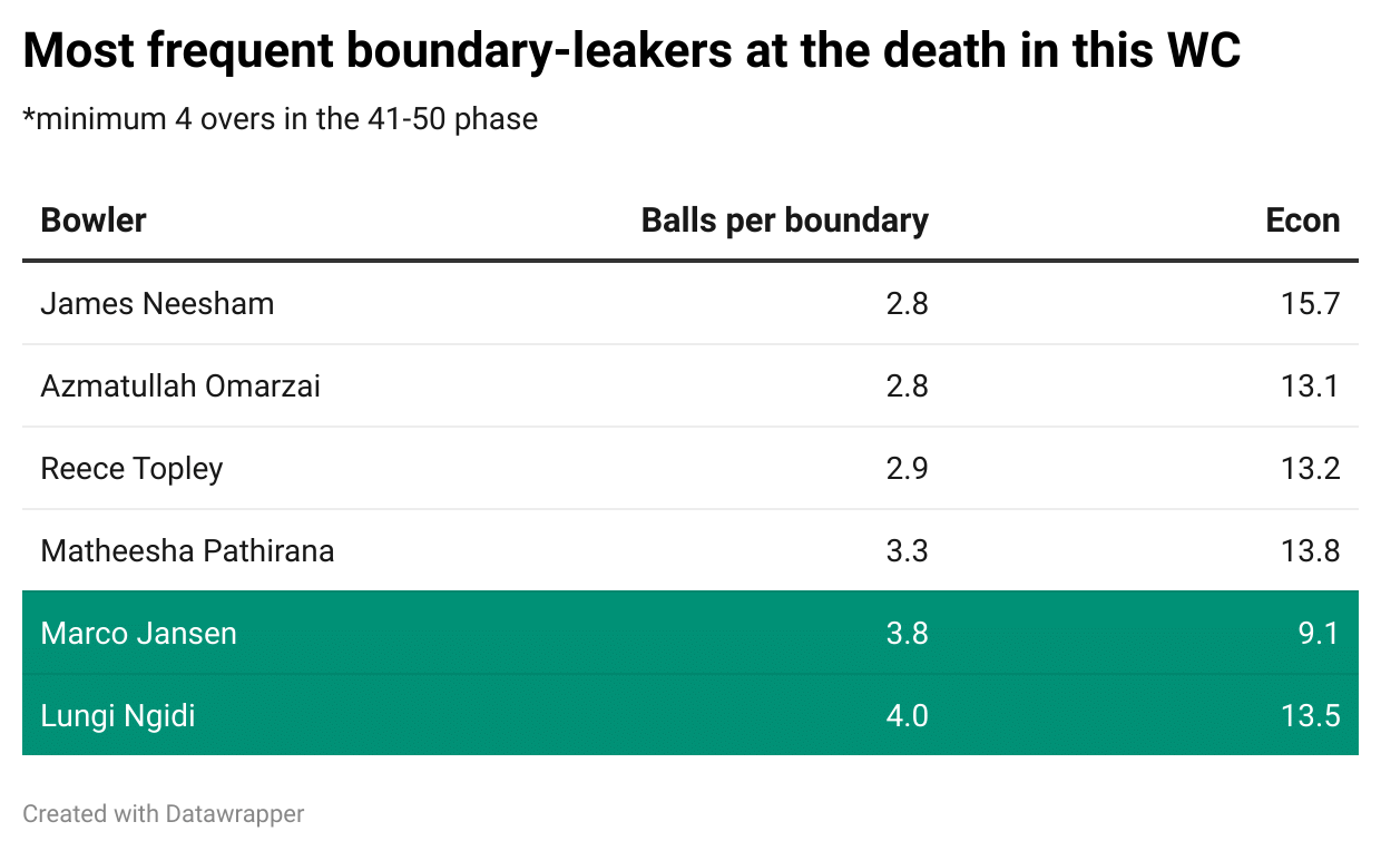 The problem doesn’t end there for South Africa as Marco Jansen, who was rested for Friday’s clash, has been getting hit even more frequently at the death than Ngidi.