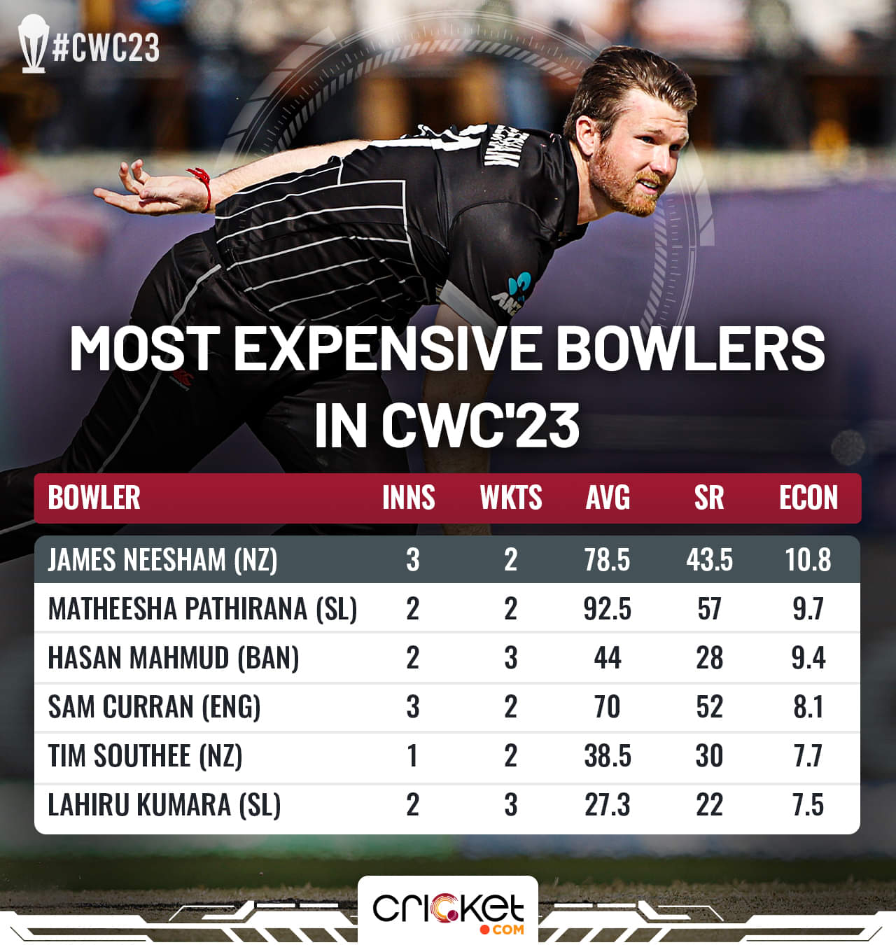 When the World Cup began, James Neesham was averaging 260 with the ball at an economy of 6.34 since 2022. In the World Cup, Neesham has brought his average down to a still-not-respectable 78.5. The economy has jumped to a far from respectable 10.8. This is the worst among bowlers who have bowled more than one over in the competition.